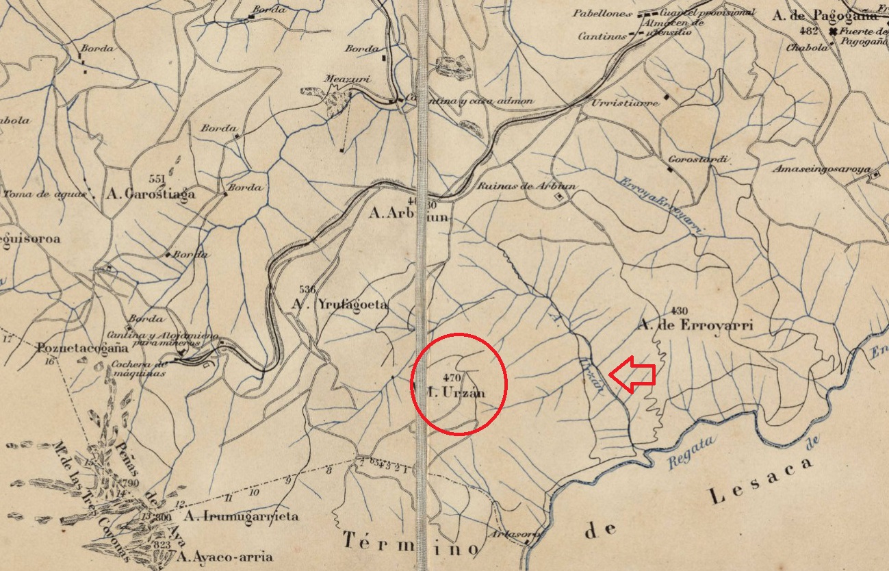 Plano de Irun de 1901 con localización del monte Urzán y la regara del mismo nombre