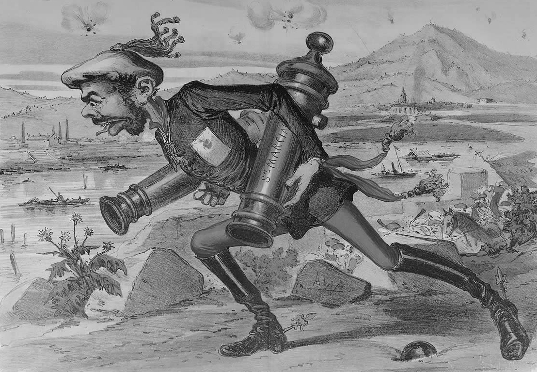 Caricatura de D. Carlos en el sitio de Irun (1833) Obsérvese que en uno de los cañones lleva escrito el nombre de San Marcial. (Grabado: colección de Ramón Guirao)